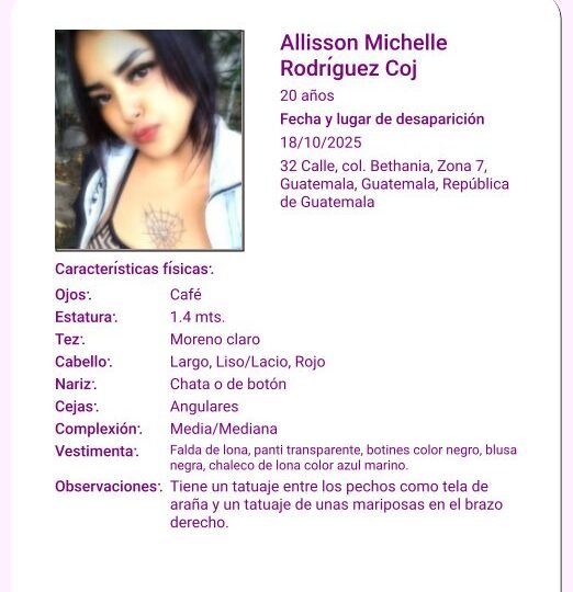 Rodríguez Coj había sido reportada como desaparecida el 18 de octubre en la colonia Bethania, zona 7 capitalina. De acuerdo con la alerta Isabel-Claudina, al momento de su desaparición vestía falda de lona, blusa negra, chaleco de lona azul marino, botines negros y panti transparente. También se detalló que tenía un tatuaje en forma de telaraña en el pecho y otro con forma de mariposa en el brazo derecho.