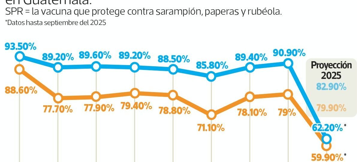 Según el Tablero de Vacunación del Ministerio de Salud, en 2017 la aplicación de la primera dosis alcanzó el 93.5% y la segunda, el 88.6%. Desde entonces, ambas han disminuido. Para septiembre del 2025, la primera dosis cubría el 62.2% y la segunda, el 59.9%. De mantenerse esa tendencia, el año cerraría con coberturas de 82.9% y 79.9%, respectivamente, las más bajas en nueve años.