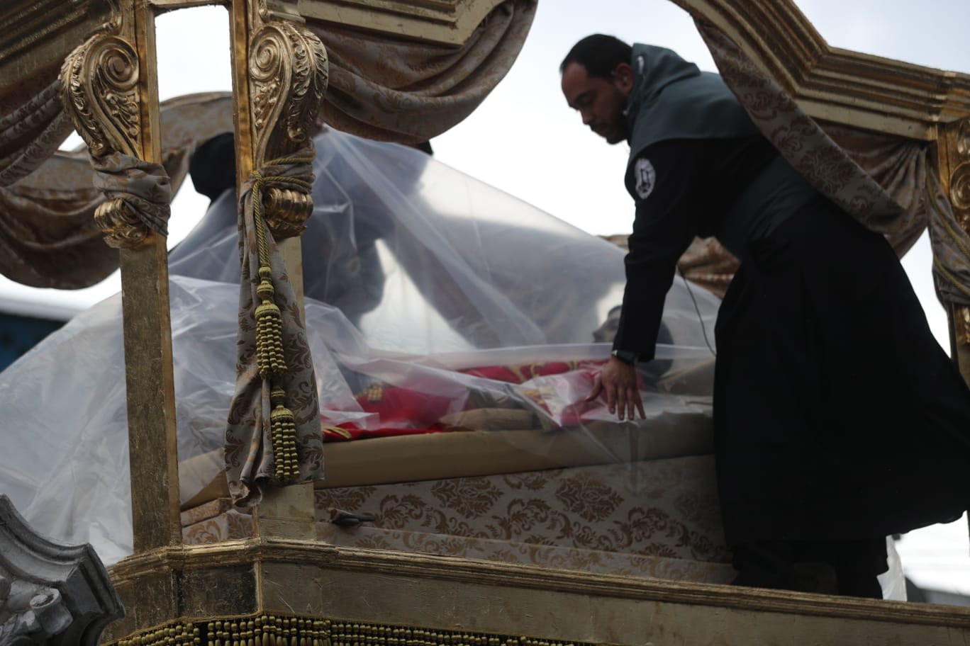 Con las primeras gotas de lluvia de la tarde, las imágenes del Santo Cristo Yacente y de la Virgen de la Soledad fueron cubiertas con plástico transparente para resguardarlas y continuar con el cortejo procesional.