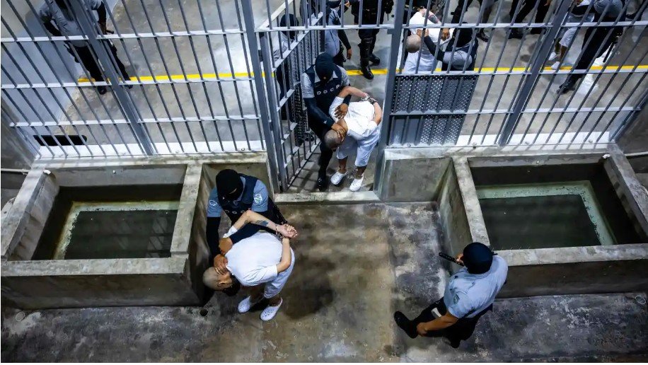 Agentes policiales y guardias de seguridad del complejo penitenciario Centro de Confinamiento del Terrorismo (CECOT) —en Tecoluca, El Salvador— realizan ronda en el interior de la cárcel de máxima seguridad, donde está detenido uno de los salvadoreños deportados desde EE. UU. y reportados como desaparecidos.  (Foto Prensa Libre: AFP)