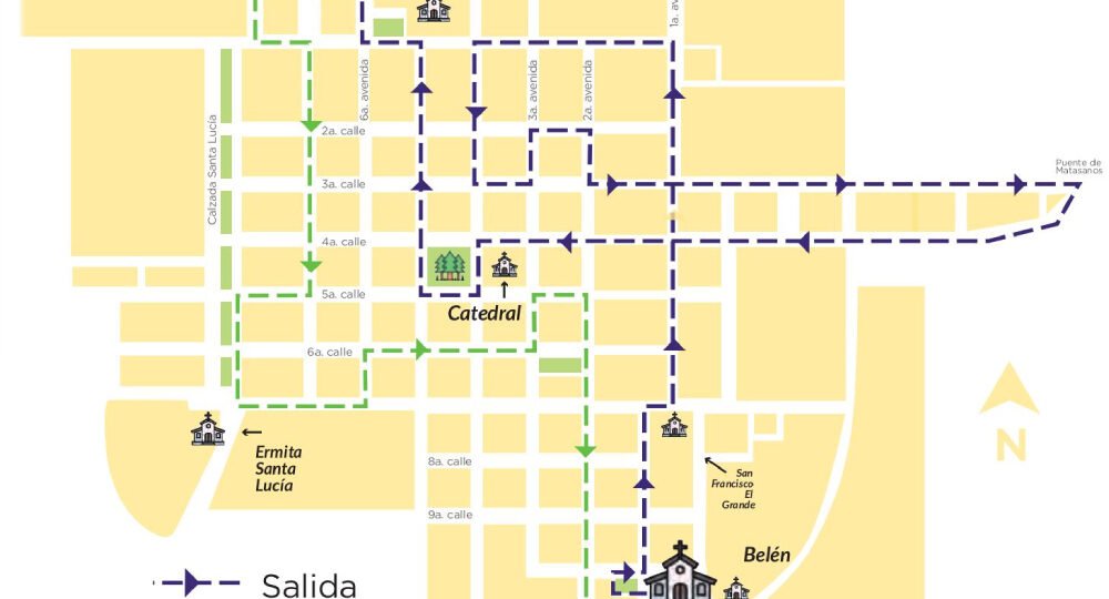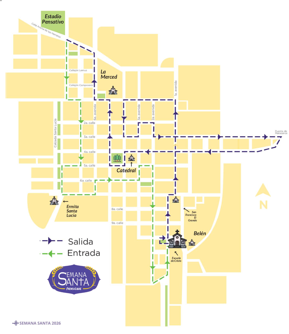 Mapa del recorrido procesional del Señor Sepultado de la Parroquia Nuestra Señora de los Remedios, Escuela de Cristo. (Diseño: Prensa Libre)