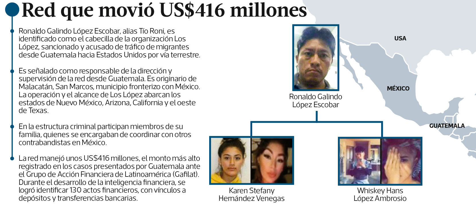 En el diagrama presentado se identifica a Ronaldo Galindo López Escobar, alias Tío Roni, como cabecilla de la organización Los López, sancionado y acusado de tráfico de migrantes desde Guatemala hacia Estados Unidos por vía terrestre. La estructura habría generado ganancias por dicho monto.